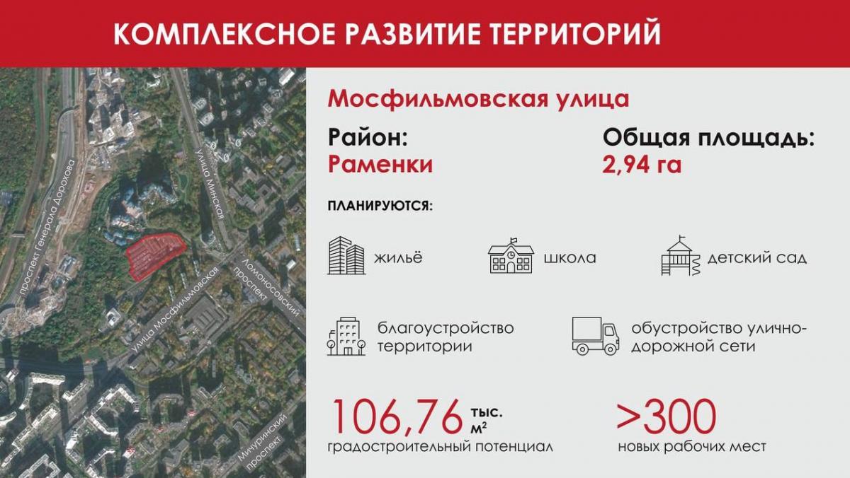 По адресу Мосфильмовская, 74-78 в рамках программы КРТ ждем почти 107 тысяч квадратных метров недвижимости. На месте гаражей появятся жилье, школа, детский садик. Площадь территории - 2,94 га.
